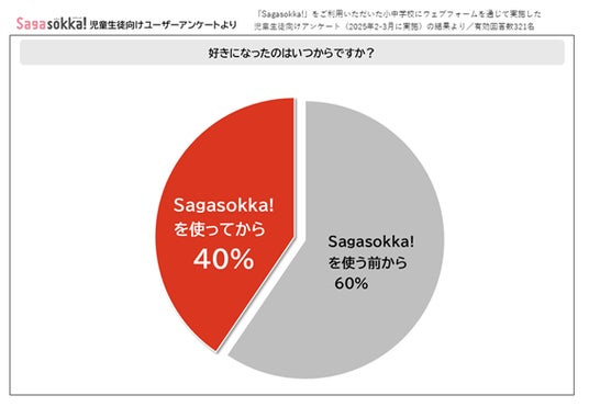 前述の「総合的な学習の時間などに、情報を集めて整理することが好きですか?」の質問において、「好き」「どちらかといえば、好き」と肯定的な回答をした児童生徒に対し、好きになった時期を尋ねると、もともと好きだったと回答する児童生徒もいるなか、40%が「Sagasokka!」を使ってから好きになったと回答しました。