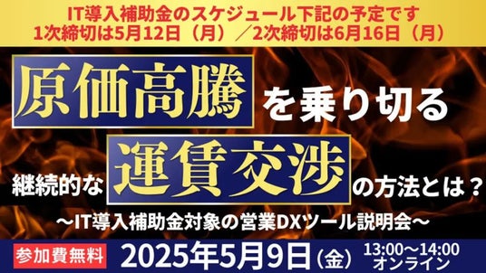 日本最大級の物流コンサルティングファーム 船井総研ロジ株式会社(本社:東京都中央区、代表:橋本直行、以下「船井総研ロジ」)は、2025年5月9日(金)13:00~14:00、 運送会社・物流会社の経営者を対象にした「原価高騰を乗り切る営業DXツール説明会」をオンラインで開催いたします。