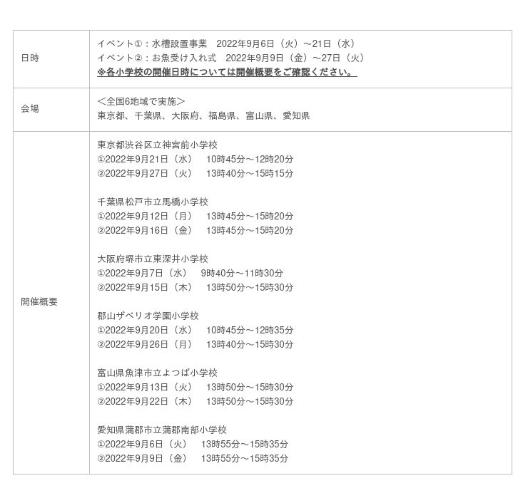 本プロジェクトへ挑戦する小学校は東京都、千葉県、大阪府、福島県、富山県、愛知県の全国6地域6つの小学校。本来食べることを目的として行われる「養殖」。2022年9月に行われる「水槽設置授業」と「お魚受け入れ式」より約半年の成育の後、子どもたちはどのような結論を導き出すのか。