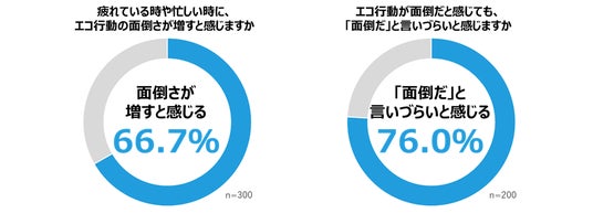 疲れている時や忙しい時に「エコ行動」の面倒さが増すかを聞いたところ7割弱の人が「面倒さが増すと感じる」と回答しました。こうした「エコ行動」が面倒だと感じても「面倒だ」と言いづらいと感じる人が76.0%に上ることが分かり、「良いことに対して文句を言いにくい」という心理が浮き彫りになりました。