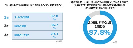 ペットボトルのラベルはがしがラクになることで期待することとして、「ストレスの軽減(37.0%)」、「時間の節約(36.7%)」、「継続のしやすさ(29.3%)」が上位となりました。週に7本以上のペットボトルのラベルをはがしている人の中で「ラクなエコ行動であればペットボトルのラベルはがしをより続けやすくなる」と感じる人は約9割で、「エコ行動」の継続において「ラク」が重要な要素であることが判明しました。
