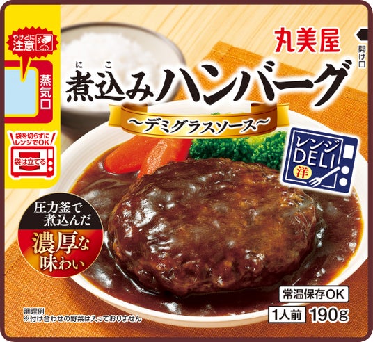 定番おかずとして人気の高い“煮込みハンバーグ”が新登場。ハンバーグは手作りも冷凍品も手間や時間がかかりますが、この商品は電子レンジ加熱(600wで約1分20秒)するだけで、完成します。肉感のあるハンバーグに肉や野菜の旨味が溶け込んだデミグラスソースを合わせました。圧力釜でじっくり煮込み、濃厚で 奥深い味わいに仕上げました。常温で12ヶ月と長期保存が可能で、普段の食事にはもちろん、備蓄食としても便利です。