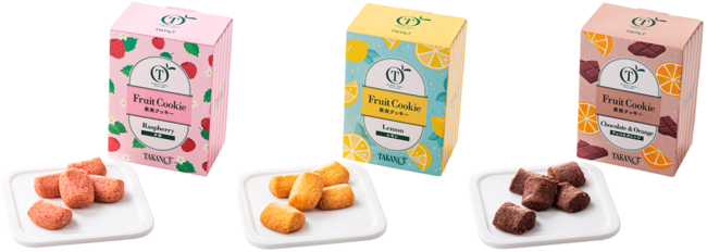 果実パウダーなどを練りこんださっくり食感のクッキー。木苺、レモン、チョコ&オレンジの3種類。