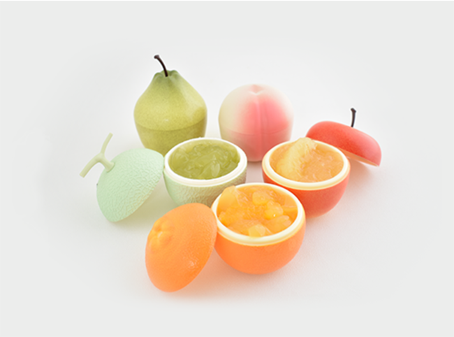 本物そっくりの果実パッケージに入った国産フルーツ使用のゼリー。フジりんご、清水白桃、マスクメロン、愛媛伊予柑、山形ラ・フランスの5種類。