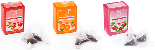 ニルギリ紅茶に香り付けしたフレーバーティー。アップル、オレンジ、ストロベリーの3種類。