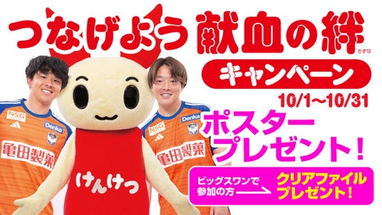 10月5日(土)鹿島アントラーズ戦の試合会場に設置する献血バス、および10月中に新潟県内の献血ルーム2ヶ所で400mL献血にご協力いただいた方に、高木善朗選手、藤原奏哉選手をモデルに起用したポスターをプレゼントいたします。