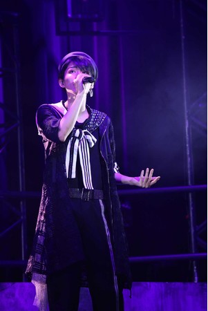 ライブ序盤のパート、その最後に登場したのはリンドウのシンガー・あじっこ。今年4月に実装されたばかりで、『項羽と虞美人』を原典としたポップなダンスチューン・「ひなげし」を、巽imustatらダンサーと共に一体感あるパラパラ(!?)で魅せつつ歌い上げた。