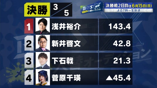 決勝第1試合では、新井が2度の4000オールで大トップとなり、+89.8ptを獲得して3位に浮上。2着の下石が1位となり、予選トップで通過した浅井が2位となりました。
