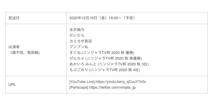 Nintendo Switch(TM)用対戦ニンジャガムアクションゲーム『ニンジャラ』にて、視聴者参加型コミュニティ番組「ニンジャラTV」の次回放送日が2020年12月18日(金)に決定いたしました。