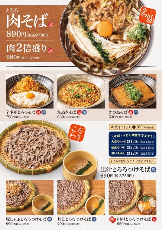 アークランドサービスホールディングス株式会社の子会社、「肉めし岡もと」などを運営する株式会社トビラダイニング(本社:東京都千代田区/代表:大内 勇一)は、とろろそば専門店「東京とろろそば」相模大野店と横浜美しが丘店にて、2024年11月1日(金)よりグランドメニューを刷新いたします。
