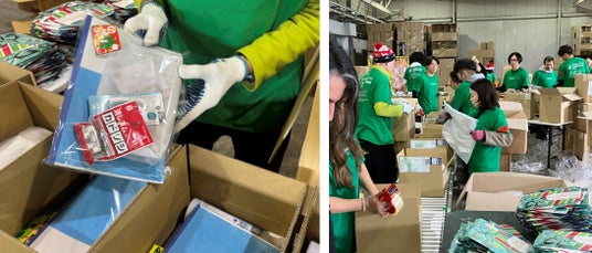 (左)梱包されるコクヨの文房具セット、(右)発送準備をするエルフたち