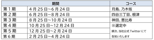 2023年4月25日(火)から2024年4月24日(水)までを2か月ごとに分けて実施いたします。なお、第4期から第6期のコースは現在選定中です。順次、東京メトロ公式Twitter等で告知いたします。ご期待ください!