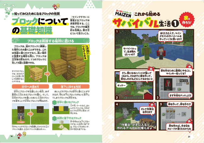 ブロックの置き方から建物・乗り物の作り方まで、マイクラの基礎が学べるぞ!