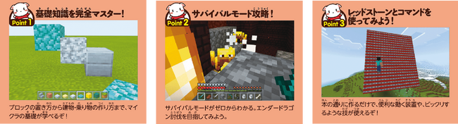 ・・・・・・サバイバルの目的としくみ/道具を作ってみよう/ブロックとアイテムのルール/安全な夜の過ごし方/より便利なアイテムを作る/体力を回復しよう!/モンスターと戦うには?/農作物の作り方/ネザーへ行ってみよう/冒険に役立つアイテムを活用する/エンダードラゴンを復活させることができる/シード値を入力してワールドを作ってみよう など