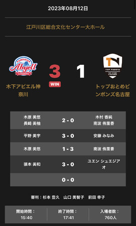 2023-08-13 一般社団法人Tリーグ ノジマTリーグ2023-2024シーズン公式戦 8月12日(土) 木下アビエル神奈川 vs トップおとめピンポンズ名古屋 試合結果 Tweet ノジマTリーグ2023-2024シーズン公式戦 8月12日(土) 木下アビエル神奈川 vs トップおとめピンポンズ名古屋の試合結果は3-1で木下アビエル神奈川が勝利しました。 企業プレスリリース詳細へ PR TIMESトップへ 公式ツイッター Follow @Straightpress 最新情報をTwitterで受け取ろう! 公式フェイスブックページ 最新情報をFacebookで受け取ろう! 前の記事 一覧へ戻る 次の記事