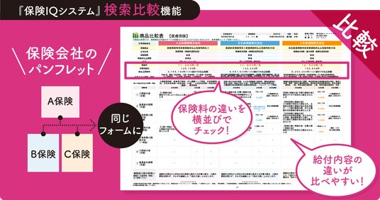 新しく保険の加入や見直しを考えている方向けの機能です。お客様のご希望をもとに保険商品を検索し、その中からさらにお客様のご希望に沿った複数の保険商品を同じフォーマットで並べた比較表をお出しします。別々の保険会社・保険商品で並べたり、同じ保険商品の中でも保障額や特約を変更して並べることもできます。ご希望に沿わない場合は条件を変更して何度でもお出し致しますので、ご納得できるまで比較頂けます。