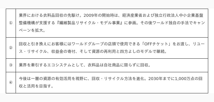 これからもワールドは「ワールド エコロモ キャンペーン」を通じて衣料品の循環をおこない、エコシステムの自律的進化を目指してまいります。