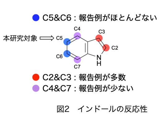 私たちの身の回りにある医薬品や機能性材料には、「インドール (図1ハイライト部分)」という共通の骨格を持つ化合物群が数多く活躍しています。例えば、片頭痛の薬や一部の抗生物質もインドールの仲間です。また、このインドールは様々な薬理効果を有するインドールアルカロイドの基本骨格でもあり、医薬化学において非常に重要な分子構造です。しかし、インドール骨格中の、ベンゼン環と呼ばれる部分の特定の位置(C5位およびC6位)は、比較的反応性が低く、特定の位置を選んで化学変換を行う「位置選択性」の制御も難しいため、これまで直接的かつ効率的な修飾法は確立されていませんでした(図2)。