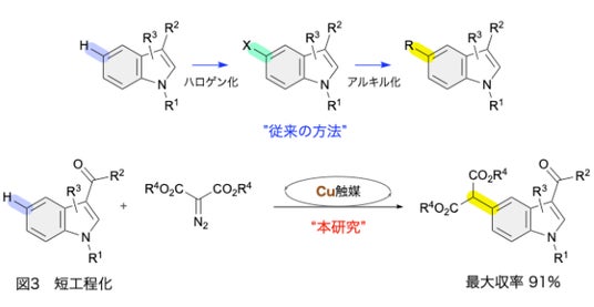 アルキル化とは、分子に炭素の鎖(アルキル基)をつける化学反応のことです。アルキル化の開発によって、分子の構造をより自在に変換できるようになることで、薬効や活性が高く新薬の候補になり得る新しい化合物を作れる可能性が高まります。既存の反応では、インドールC5位のC-H結合を直接的かつ効率的にアルキル化することは困難であり、アルキル化体を合成するためにはハロゲン化など多段階を経由する必要がありました(図3上部)。そこで本研究では、ジアゾ基(C=N2)を有する化合物と銅触媒を用いて銅カルベン種を発生させ、それをインドール誘導体と反応させることで、C5位に炭素鎖(黄色ハイライト部分)を導入する反応の開発に挑戦し、最大91%という優れた収率で目的物を得ることに成功しました(図3下部)。この反応は様々な構造をもったインドール誘導体に適用可能であるため、多様な医薬品候補分子を効率的に合成する道を拓きます。