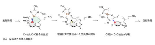 研究グループは、DFT計算(注4)を駆使して反応機構の解析を行うことで、興味深い機構で反応が進行している可能性を見出しました。理論計算によって導き出された仮説は、アルキル化反応がインドールC5位で直接起こるのではなく、C4位で炭素-炭素(C-C)結合を形成(図4左)した後、3つの原子が環状につながる、三員環構造を有する中間体(図4中央)を経て、C5位に結合が移動(図4右)するというものでした。この仮説の妥当性を検証すべく実験を行ったところ、理論計算により導かれた反応経路の裏付けとなる実験結果が得られました。