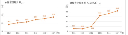 また男性育休取得率(1日以上)は、2026年までに100%を目指す中、2024年度実績は84.3%。前年(2023年度実績)比11.3pt増で過去最高となりました。