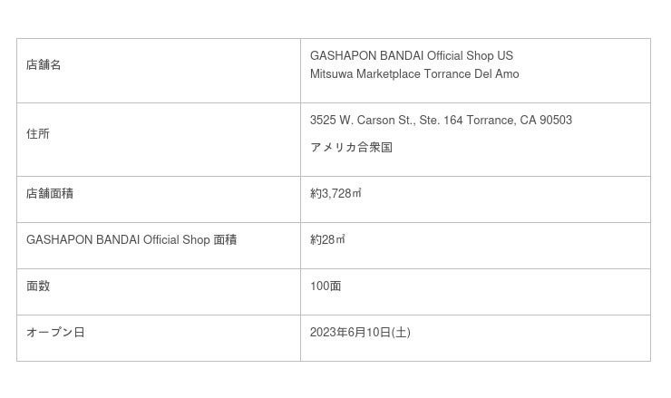 アメリカ・カリフォルニア州にある「Mitsuwa Marketplace Torrance Del Amo」店内に「GASHAPON BANDAI Official Shop」を2023年6月10日(土)にオープンします。同店が出店する「Mitsuwa Marketplace(ミツワ マーケットプレイス)」は総合商社カメイ株式会社[東証P/8037]傘下のMitsuwa Corporationが全米12店舗で展開する、日系テナントが多く入居するショッピングセンターチェーン店です。また、出店エリアのTorrance(トーランス)はカリフォルニア州の中でも日系アメリカ人が古くから多く住む街で、日本の文化や商品との親和性が高い店舗・エリアといえます。