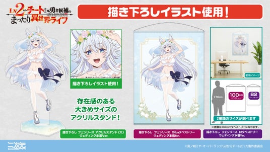 『Lv2からチートだった元勇者候補のまったり異世界ライフ』より、「描き下ろし フェンリース アクリルスタンド(大)ウェディング水着Ver.」「描き下ろし フェンリース 100cmタペストリー ウェディング水着Ver.」など、新グッズが二次元コスパから登場です。