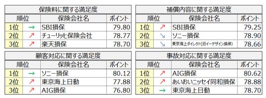 昨年の3位から順位を上げて1位に輝いたのはSBI損保です。2位は昨年1位のソニー損保、3位は昨年2位の東京海上ダイレクト(旧イーデザイン損保)が続いています。SBI損保は保険料部門も1位を獲得しています。