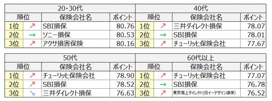 1位のSBI損保は、保険料部門、補償内容部門でも1位となり、昨年の4位より大きく順位を上げました。2位のソニー損保は、顧客対応部門で1位となり、昨年に引き続きランキング上位となりました。3位は、50代・60代の総合満足度が高いチューリッヒ保険会社となりました。