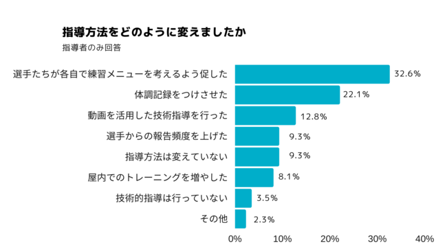 指導方法を変更せざるを得ない状況だったチームの指導者に、どのように指導方法を変えたのか聞いてみると、「選手たちが各自で練習メニューを考えるよう促した」32.6%、「体調記録をつけさせた」22.1%となり、半数以上の指導者が技能向上に向けて選手自身にやるべきことを考えさせたり、体調記録をつけて自己管理させるなど、自主性を重んじた指導方法に転換したことがわかりました。これまで指導者が指示していた練習メニューや体調管理について、選手が主体的に考えて実践することが求められているようです。