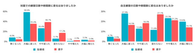 感染拡大を回避するために自主練習を含め、練習自体を減らしたチームと、対面での練習に制限がある分、自主練習に力を入れたチームがおよそ半々に分かれる結果となりました。