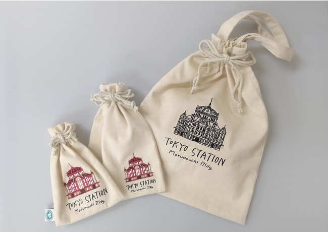 オープンを記念し、東京駅丸の内駅舎デザインのオリジナル巾着2種と巾着トート1種を発売。