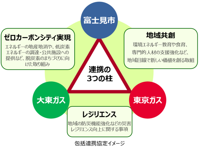 富士見市の第3次環境基本計画において、脱炭素のまちづくりの推進、再生可能エネルギーの活用推進、環境教育・環境学習の推進、安全で快適なまちづくりの推進等が掲げられている中、この包括連携協定を通じて、太陽光PPA事業、EVのカーシェアリング、カーボンニュートラル都市ガスやCO2フリー電気をはじめとする脱炭素化に向けた取り組みのご提案、さらに災害時のレジリエンス強化に資する取り組みのご提案等を行っていくことで、富士見市の住みよいまちづくりと地域課題の解決に貢献してまいります。