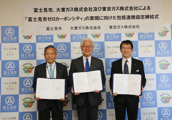 富士見市(市長:星野 光弘)、大東ガス株式会社(社長:清水 宏之介、以下「大東ガス」)、東京ガス株式会社(社長:笹山 晋一、以下「東京ガス」)は、このたび、「富士見市ゼロカーボンシティ」の実現に向けた包括連携協定(以下、「本協定」)を締結しました。