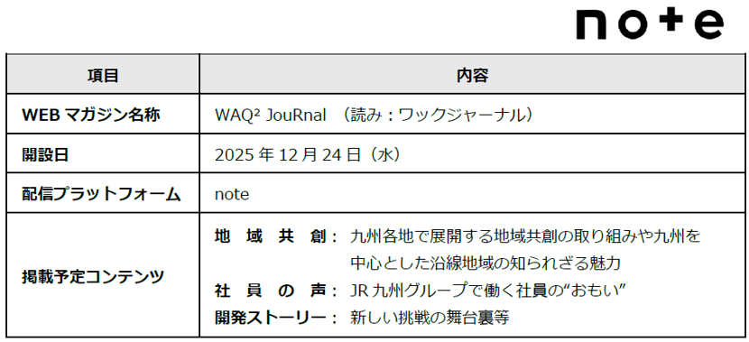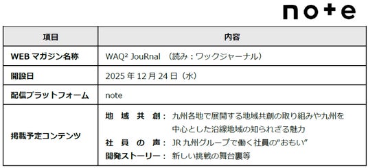 九州旅客鉄道株式会社(以下、JR 九州)は、2025 年 12 月 24 日(水)より、note 上で JR 九州公式 WEB マガジン「WAQ² JouRnal(ワックジャーナル)」を新たに開設します。