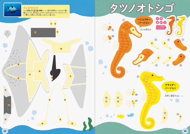 イルカ・サメ・カエル・ペンギンなど、水族館で人気のいきものたちが紙飛行機になって空を飛ぶ! いきものの生態や空飛ぶ仕組みを学びながら、楽しく工作ができるペーパークラフトブックです。作り方や飛ばし方はイラストつきでわかりやすく解説。部品はミシン目つきで簡単に切りはがせます。