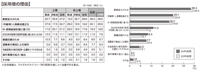 採用増と回答した企業の理由は、「業務拡大のため」が28.3%で最多に。昨年同様の結果となりました。