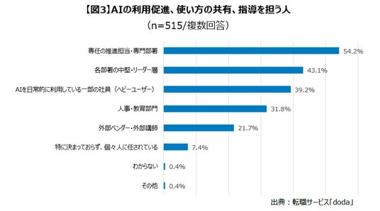 また、AIの活用促進やツールの使い方に関する共有・指導を誰が担っているか複数回答で聞いたところ、「専任の推進担当・専門部署」が54.2%で最も高くなりました【図3】。