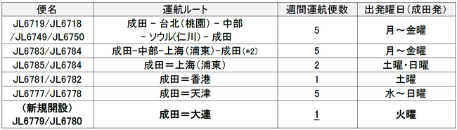 (*2) JL6783・・・成田 - 中部 - 上海(浦東)、JL6784・・・上海(浦東) - 成田