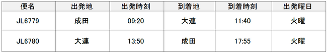 ・6月18日より成田=大連線(JL6779/JL6780)を新規開設し、週1便で運航します。
