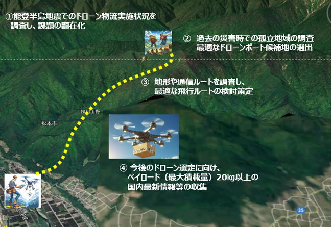 東日本電信電話株式会社長野支店(支店長:茂谷 浩子、以下「NTT 東日本」)は、令和6年度デジタルシティ松本推進機構(愛称DigiMAT)(※1)の調査研究プロジェクト(※2)の募集において採択され、「デジタルシティ松本推進機構プロジェクト推進補助金」(※3)を活用し、長野県松本市における自然災害などの緊急時に孤立地域となる可能性が高いエリアへの「ドローン物流」による支援スキームの構築を行うため調査研究プロジェクトを2024年8月より開始します。
