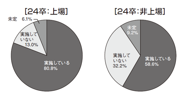 インターンシップを「実施している」企業は前年比2.0ポイント増となる61.7%。実施企業を上場有無で比べると、上場企業は80.8%、非上場企業は58.6%と差があることが分かりました。予算や人手をやり繰りしやすい上場企業の方がインターンシップを実施しやすい状況にあると言えます。