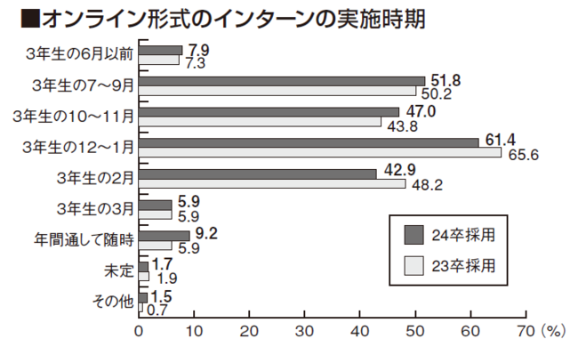2024年卒学生を対象とするインターンシップを「3年生の夏や秋」に実施した企業の割合が前年度と比べ増加。一方、12月以降に開催した企業の割合は減少しており、より早い時期に学生との接点を持ちたいという企業の意向が見て取れます。