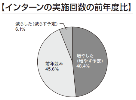 インターンシップの実施回数は前年と比べ「増やした(増やす予定)」が48.4%と半数に迫り、「前年並み」(45.6%)を上回りました。年々インターンシップの重要性が増す中、学生との接点をできるだけ多く設けようという企業が目立ちます。