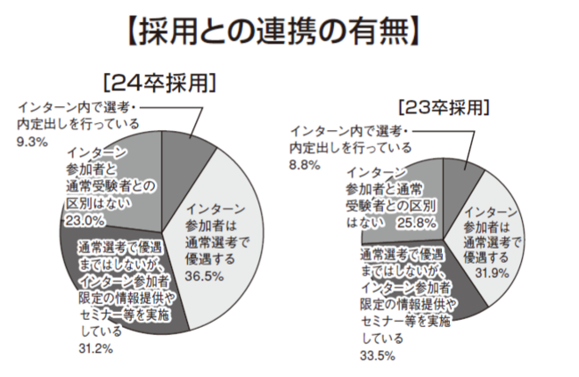 インターンシップと採用との連携について、「インターン参加者は通常選考で優遇する」が36.5%で最多に。2023年卒に関する同調査では「通常選考で優遇まではしないが、インターン参加者限定の情報提供やセミナー等を実施している」が最多でしたが、今回初めて「通常選考で優遇する」が上回りました。インターンシップ実施を実質的に採用活動と連動させる動きが広がっています。