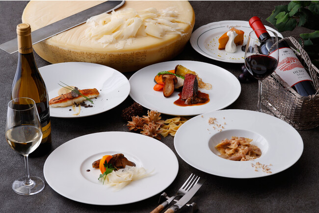 前菜は滋味あふれるアワビ茸とイタリアンソーセージのサルシッチャに、1000年以上の歴史をもつ上質なミルクを使用して熟成されたロディジャーノチーズを添えた、香ばしい香りとコク深くクリーミーな旨味が魅力の贅沢な一皿です。パスタは、リボン型の“ファルファッレ”に濃厚なマッシュルームのクリームソースを絡め、風味豊かな栗を削った芳醇な香りに包まれる一品に仕上げました。魚料理には、三崎より直送される新鮮な魚を、肉料理には香り高いポルチーニ茸の風味を生かしたソースでお召し上がりいただきます。 前菜からドルチェにいたるまで、深まりゆく秋の味覚をちりばめた実りの秋をご堪能いただけるディナーコースです。秋のイタリアへ旅をしているかのようなお食事のひとときを、どうぞごゆっくりご堪能ください。