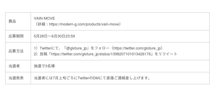 株式会社Gloture(本社:東京都港区、代表取締役:CHEN JUNYI)は、ECサイト『GLOTURE.JP』で好評販売中の高音質Bluetoothイヤホン「VAIN MOVE」について、GlotureのTwitterアカウントをフォローし、対象の投稿をリツイートすることで、抽選で3名様に当たるキャンペーンを5月28日より行っています。スウェーデン発、aptX搭載のスタイリッシュで高品質なイヤホンが手に入るチャンスなので、この機会にぜひご応募ください。(6月30日締め切り)