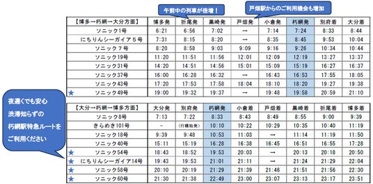 2026 年3月14 日から夕方・夜間を重点的に増強し、現行比1.6 倍の上下計16 本に増やします。航空便が多く就航する朝夕の時間帯を中心に、特急「ソニック」「にちりんシーガイア」「きらめき」を停車させることで、北九州空港特急ルートの利便性を向上させます。
