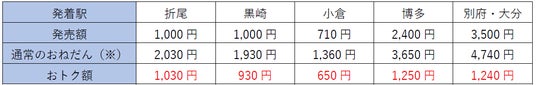 (※)発着駅~朽網駅の運賃、自由席特急料金と朽網駅~北九州空港のエアポートバスの運賃の合算です。