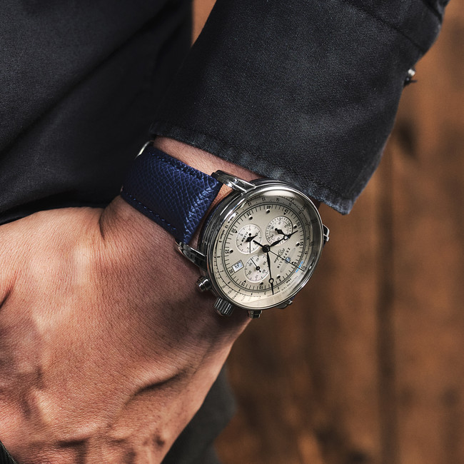 本作は、腕時計「ツェッペリン」のベストセラー「100周年記念シリーズクロノグラフアラーム」をベースに、世界的に有名な名門タンナー「ワインハイマー」社製の高品質レザーから制作されたベルトを一体化させた腕時計です。